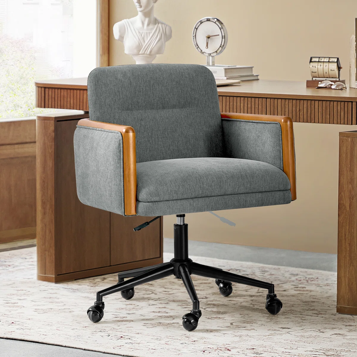 Kursi Kerja Kantor ini berbalut sofa kain dan busa empuk yang akan memberikan Anda kenyamanan saat bekerja. Dilengkapi roda kecil pada kakinya bisa membuat Anda leluasa bergerak maupun berpindah satu tempat, ada juga tuas dibawah yang bisa mengatur ketinggian sesuai postur tubuh Anda dan Kenyamanan Anda.