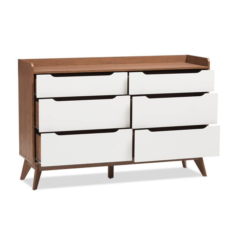 Bergaya modern nan trendi masa kini dengan konsep minimalis scandinavian model 6 laci terbaru. Desainya sangat kekinian dengan bentuk kaki ramping meruncing khas retro modern yang sedang hits saat ini. Tentunya tampilan warna finishingnya sangat keren dan trendi. Dengan warna kombinasi wood finishing warna walnut dikombinasikan dengan duco finishing warna white pada bagian 6 lacinya.