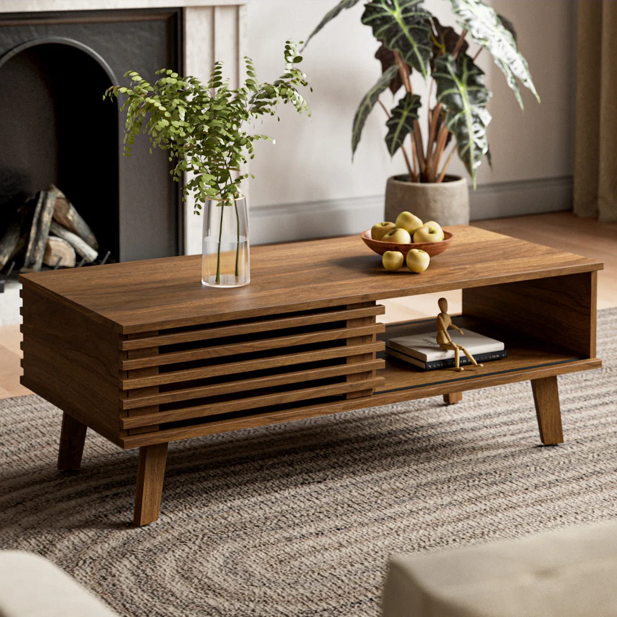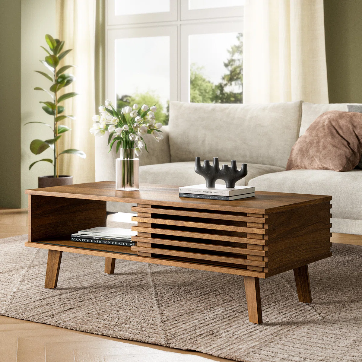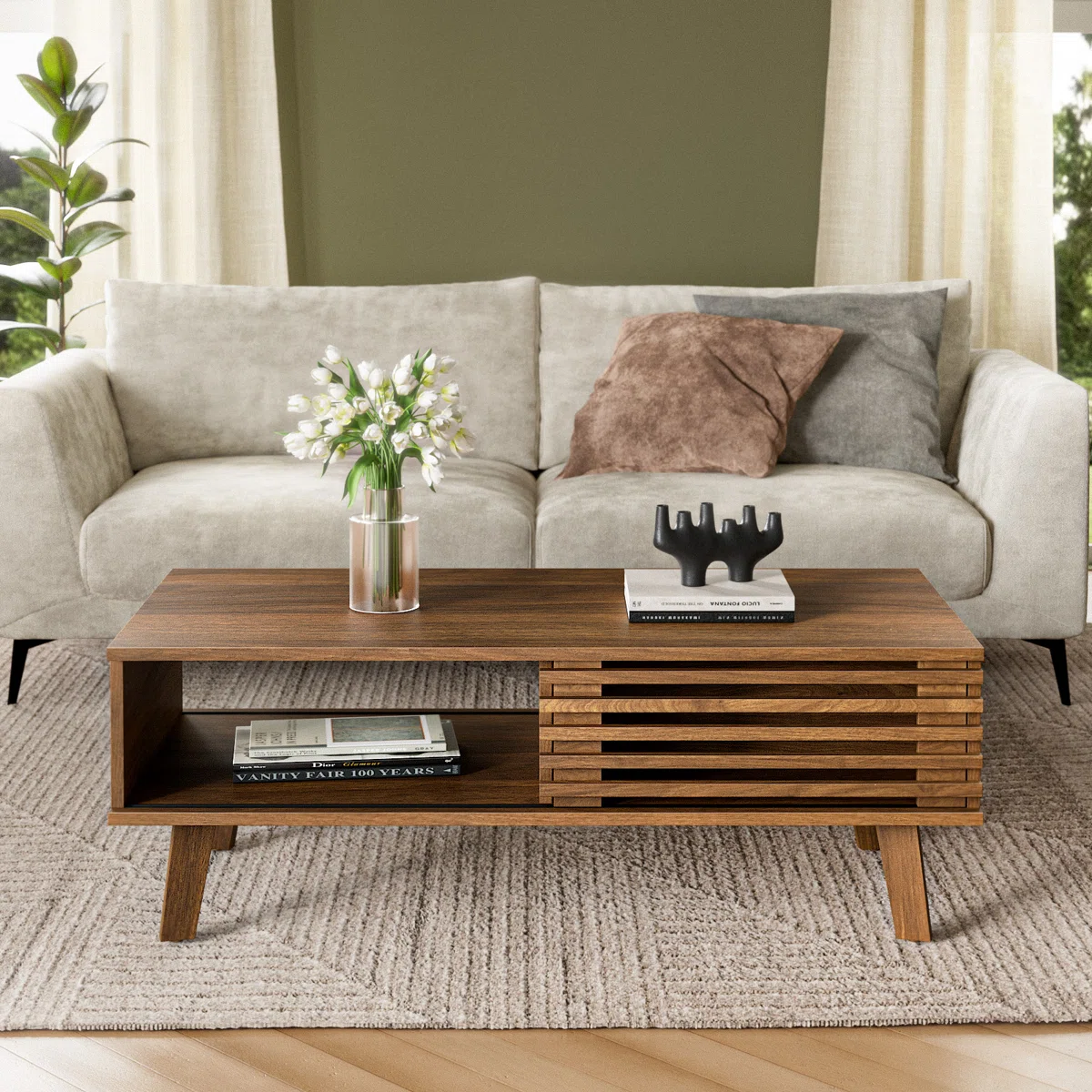 Meja Tamu Minimalis ini memiliki kaki lemari berwarna dengan tepi miring dan bingkai persegi untuk tampilan estetika modern. Meja kopi dengan penyimpanan dilengkapi dengan lemari yang dapat ditutup dan rak penyimpanan terbuka. Permukaan meja yang luas dan rak penyimpanan terbuka sangat cocok untuk majalah, remote, atau barang-barang lain. Panel pintu geser memudahkan penyimpanan barang dan menjaga ruangan tetap rapi.