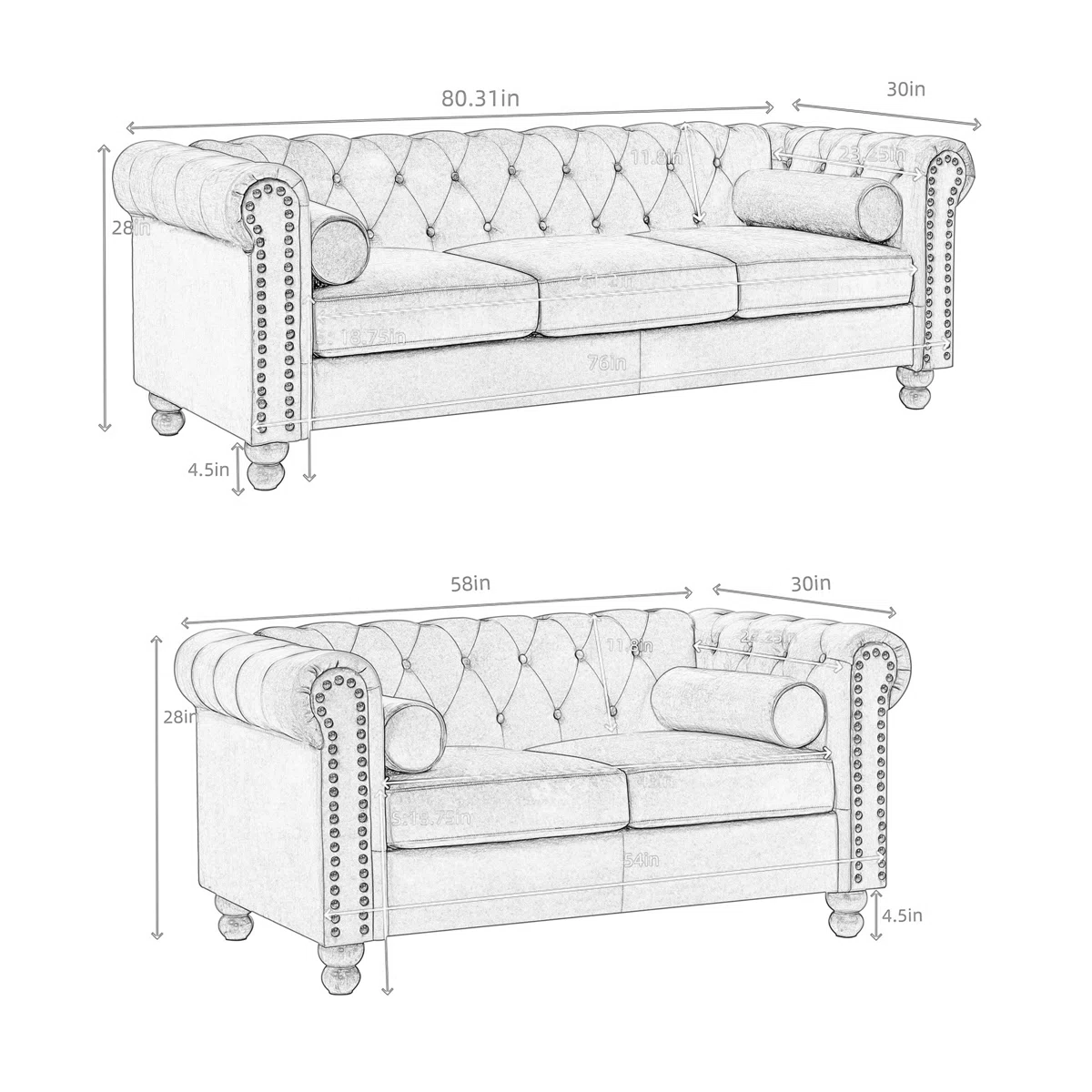 • Sofa 3 Seater : P 203 cm x L 80 cm x T 75  cm