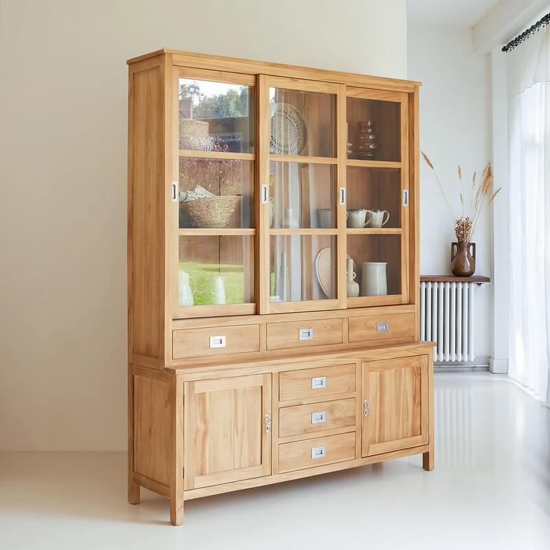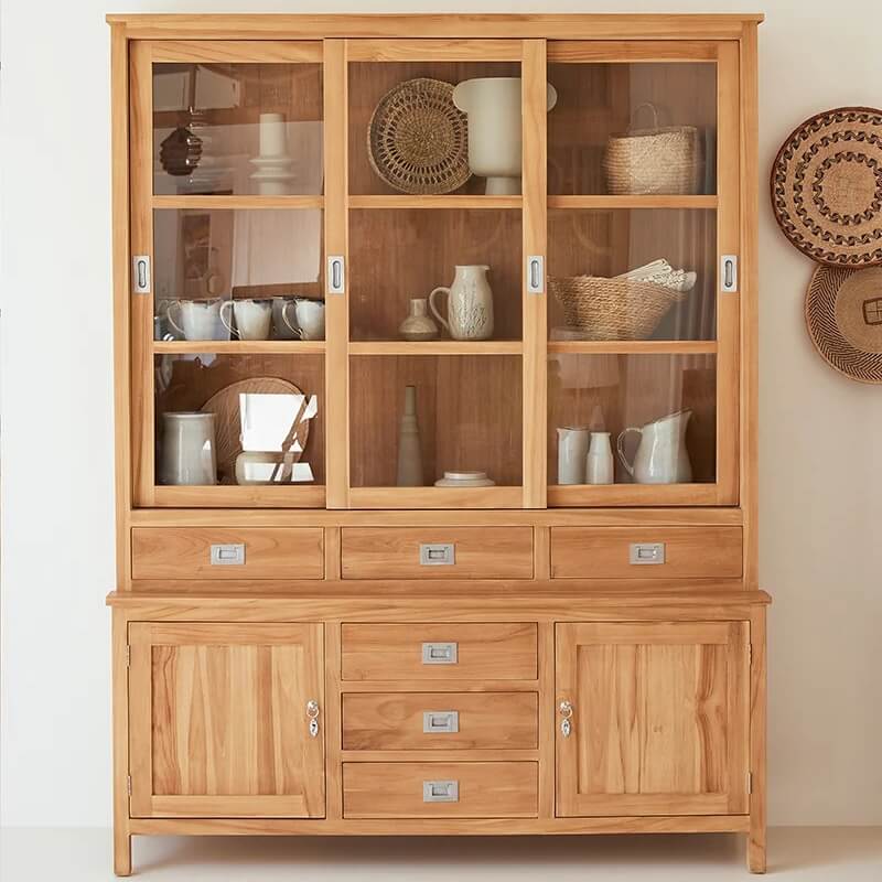Merupakan salah satu pilihan tepat bagi anda yang sedang mencari furniture, khususnya untuk pelengkap dapur. Karena lemari dapur ini dioleh menggunakan bahan kayu jati kualitas bagus. Dan didesain dengan konsep minimalis model terbaru yang mana menggunakan pintu sliding dengan daun pintu kaca. Serta terdapat laci dan tempat penyimpanan berpintu pada bagian bawahnya. Dan dipercantik dengan lapisan wood finishing warn natural yang mampu memaximalkan keindahan serat kayu jati yang exotis.