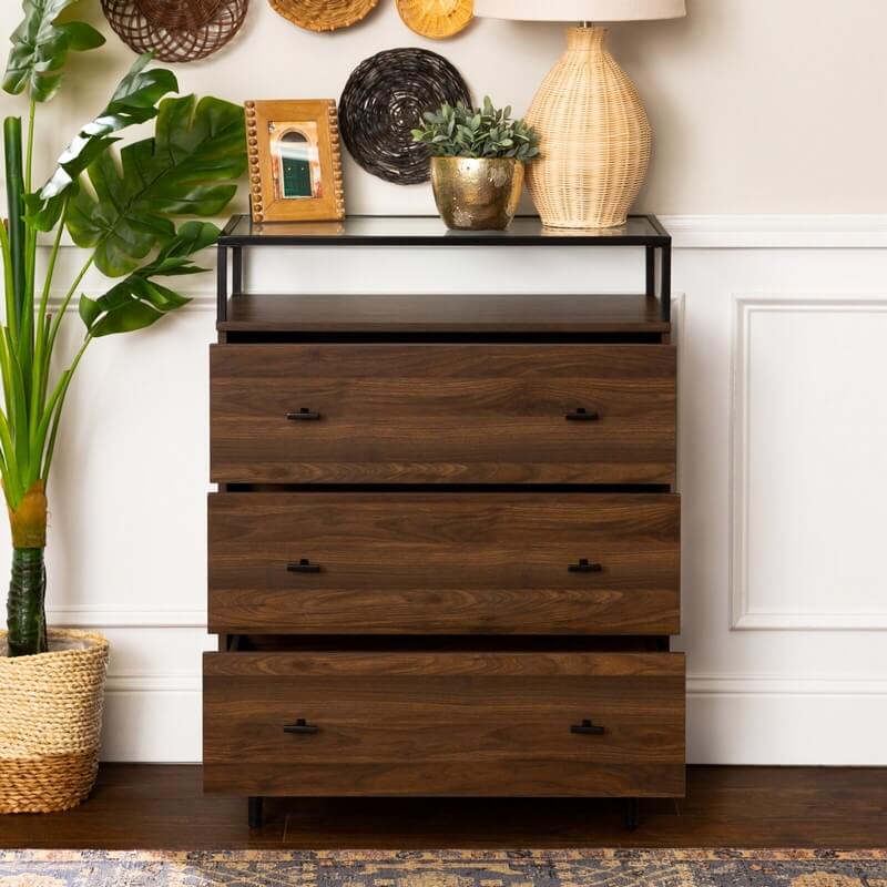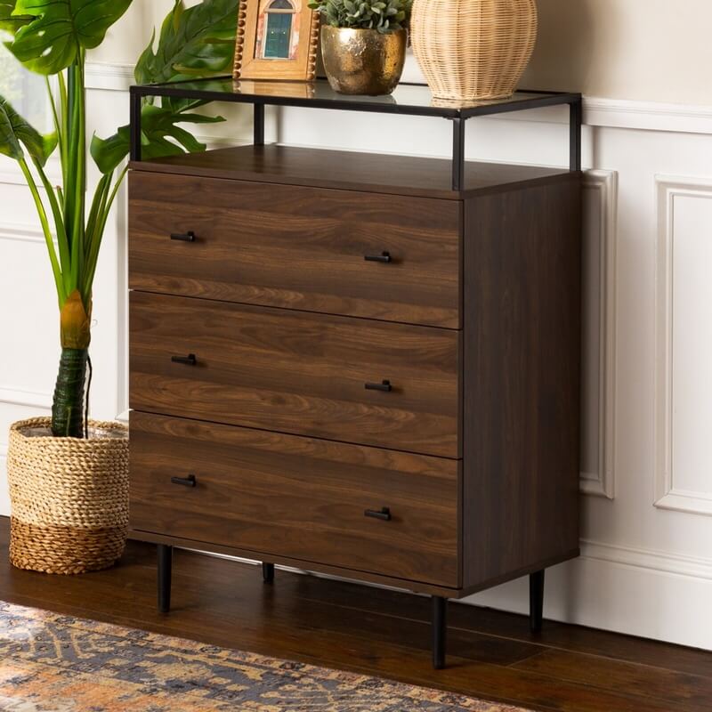 Salah satu varian yang patut anda jadikan referensi pada awal tahun ini untuk melengkapi furniture di kamar tidur anda. Karena lemari laci yang terbuat dari bahan kayu jati ini mengusung tema minimalis gaya terbaru masa kini. Yang mana terdapat tambahan bahan besi dan juga kaca pada bagian atasnya agar desainnya lebih modis dan kekinian. Serta visualnya juga sangat indah dengan lapisan wood finishing warna walnut brown. Sehingga dengan kehadirannya selain membuat interior kamar anda semakin keren, juga dapat mempercantik dengan warna indah dan berkelas.