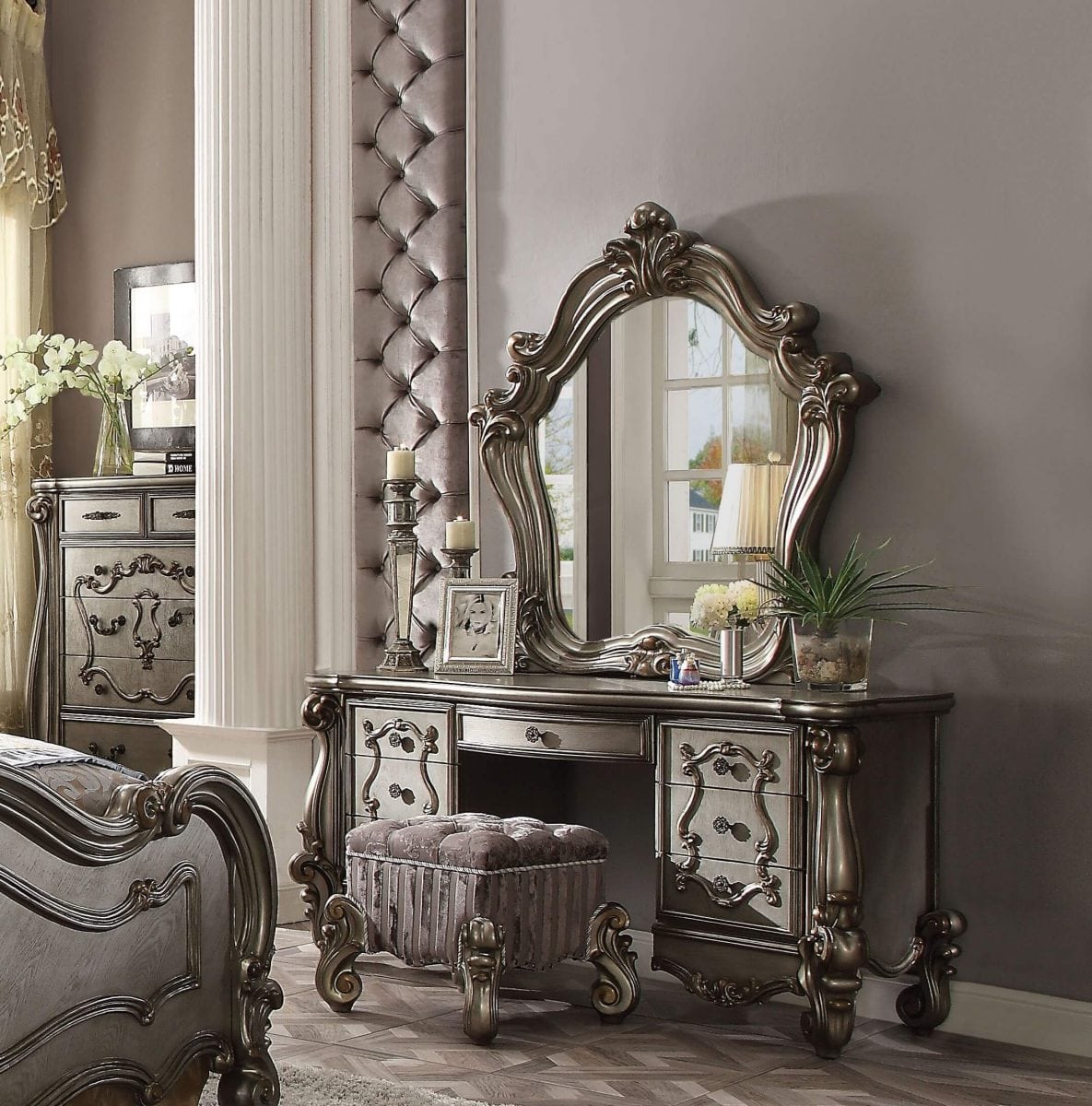 Meja rias dengan hiasan ukiran klasik yang elegan dengan pesona classic yang dimiliki, didukung dengan finishing antik. Dengan cermin sangat besar menambah selera tersendiri dalam berdandan.