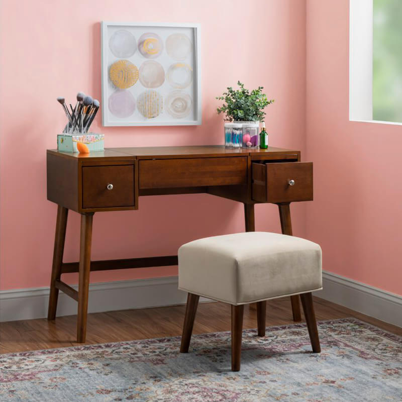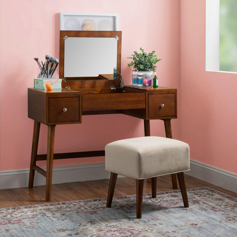 Merupakan pilihan yang cocok untuk melengkapi kebutuhan furniture pada kamar anda. Terlebih untuk membantu anda dalam berdandan atau merias diri ketika anda mau pergi keluar rumah. Pastinya meja rias ini diolah menggunakan bahan kayu jati pilihan oleh pengerajin jepara berpengalaman. Dan untuk desainnya, mengusung tema minimalis retro modern yang belakangan ini banyak peminatnya untuk melengkapi furniture. Serta visualnya juga sangat memukau dengan lapisan wood finsihing warna walnut brown semi gloss yang menjadikannya semakin cantik.