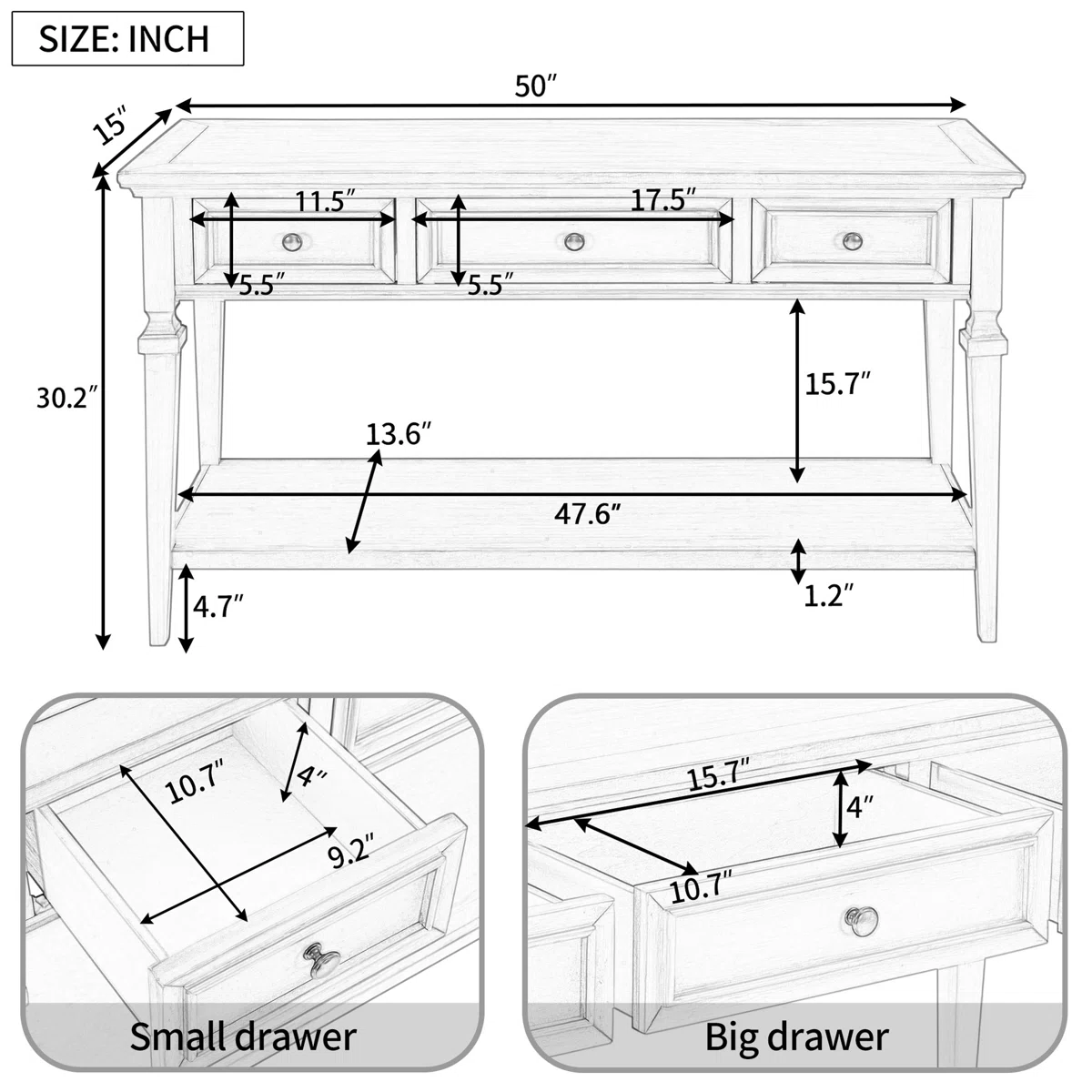 - Meja Konsol : P 127 cm x L 38 cm x T 76 cm