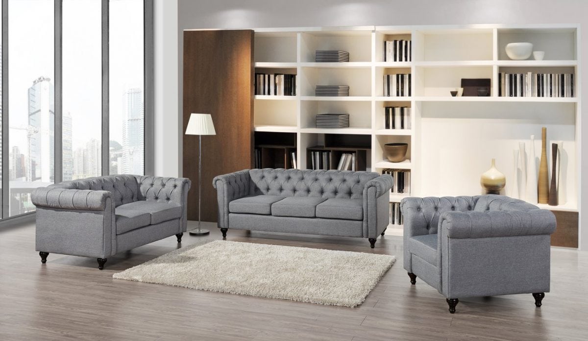 Set kursi tamu sofa dengan desain yang menarik. Balutan kain dihias dengan kancing untuk memberi kesan yang lebih indah. Warna juga dibuat nuansa yang hangat dan Anda juga bisa memesan dengan warna yang berbeda.